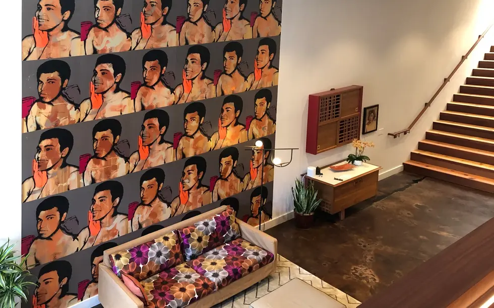 Handscreened monoprint wallpaper developed at Flavor Paper from Warhol’s original 1977 Polaroids of Muhammad Ali, provided by the Warhol Foundation. Each image is painted directly onto the silkscreen, making every impression a unique expression—capturing the dynamic force of both subject and process. Framed in halftoned black for the GOAT himself, this bold, repeating pattern stands as a tribute to Ali’s enduring legacy.